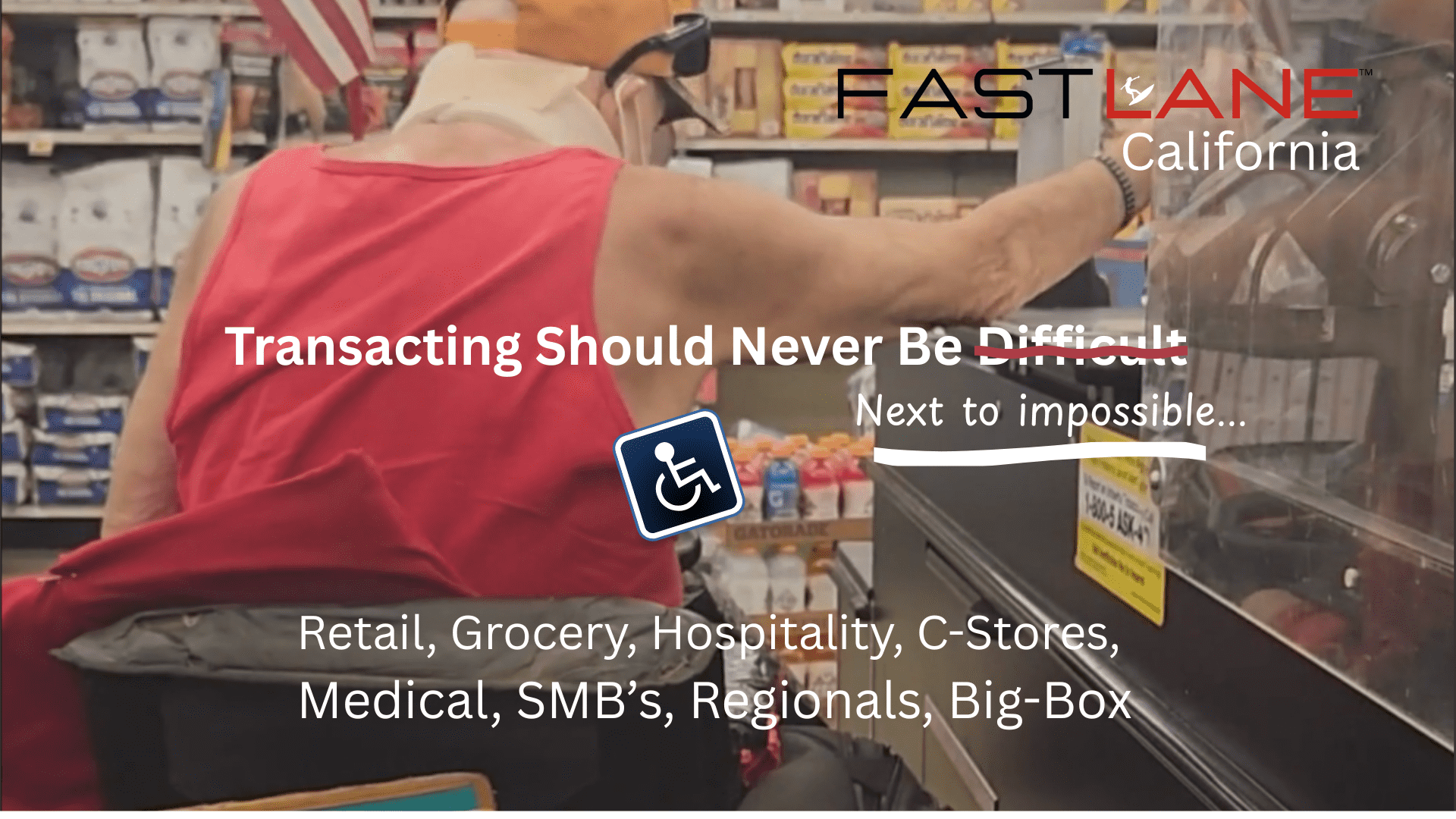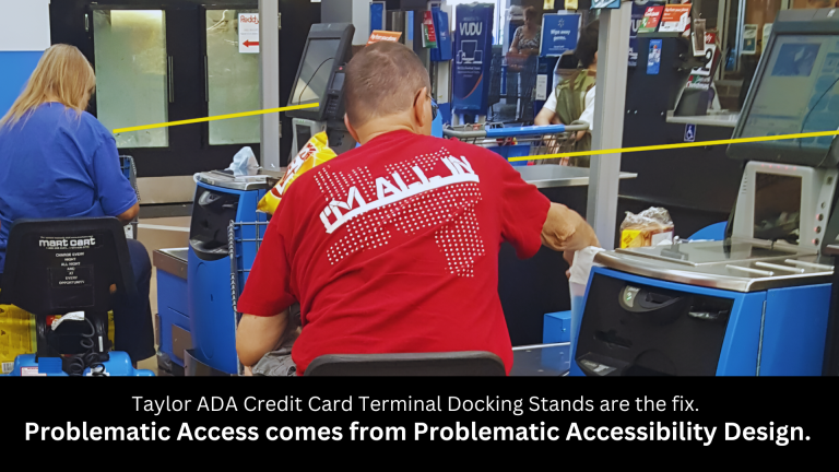 A designated ADA and PCI (POI)-compliant checkout is required—whether it’s a countertop, service counter, self-checkout, or traditional checkout lane. These areas often meet ADA width standards and display accessibility signage, but the payment terminals themselves are hard-fixed in place and positioned out of reach or view for many users.