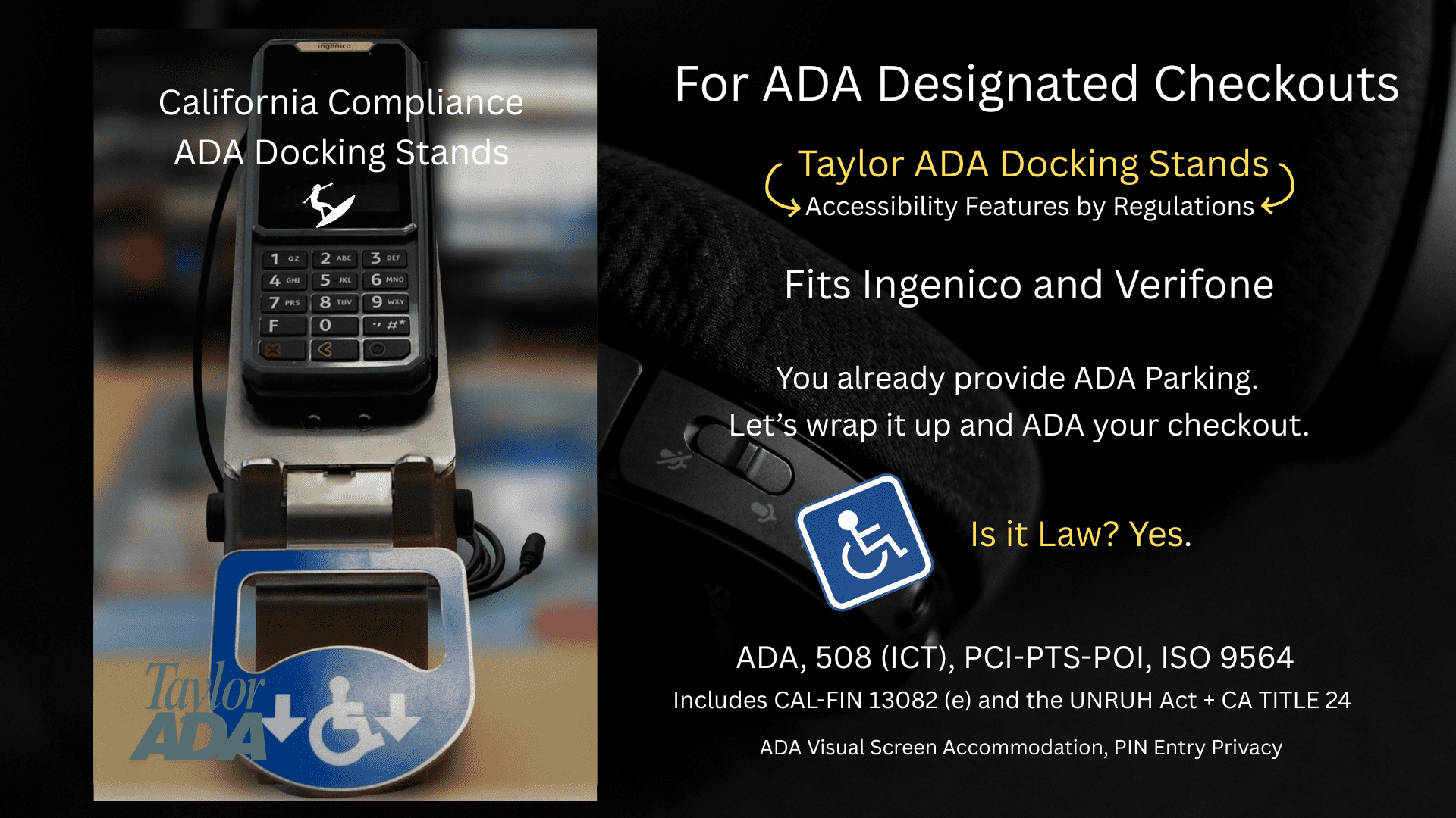 Taylor ADA Docking Stands solve these accessibility gaps, ensuring full compliance with ADA, the Unruh Civil Rights Act, and PCI-POI standards.